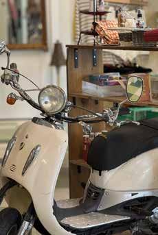 A moped at the thrift store represents the various forms of transport kids use, such as skateboards and bikes.