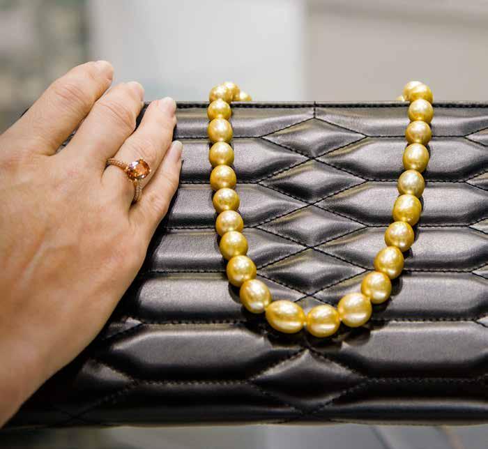 Of course, gold accommodates more than just the gleaming metal. Think about reflecting this color scheme with your accessories, ranging from gold-colored eyeglass frames to gemstones and scarves. Here we feature a Rose Gold Imperial Topaz and Diamond Ring ($5,250) and a rare 18”long strand of Natural South Seas Golden Pearls with 14 Karat yellow gold clasp ($7,250). Note that new pearls are becoming harder to source given the fragility of the ocean’s pearl oyster ecosystem.