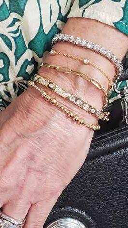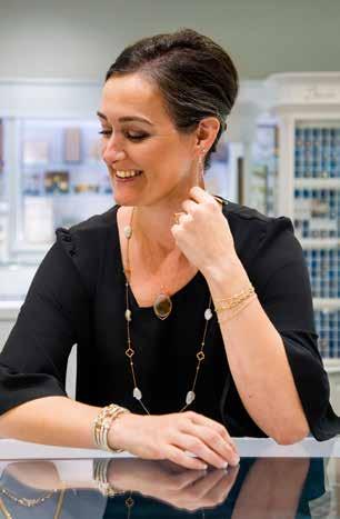 Gold is making a comeback this Fall – in fashion as well as on Wall Street. The trend embraces the eclectic, pairing pieces you’ve had sitting in your jewelry box for years, like bangles from Mom, with a new piece or two to create a modern stack. Ketterman’s Jewelers’ Richi Norman layers multiple pieces of different styles and textures to create her own look. On the facing page, Richi is wearing Fossilized Coral drop earrings ($189); a Moss Agate Rose Gold Necklace ($1,995) and a long Rose Gold, Pearl and Diamond Station Necklace ($2,565). On her right wrist is a VAHAN Bracelet