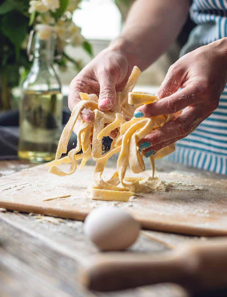 1. Mound the flour in the center of a work surface with a well in the middle. Crack the eggs into the well and beat with a fork until smooth, then work flour into eggs with the fork. Use a bench scraper to work in the rest of the flour a little at a time. When the flour is incorporated, form the dough with your hands into a rounded mass for kneading. Lightly dust your workspace with flour and knead dough about 10 minutes, until smooth and elastic. Cover dough with a bowl or plastic wrap and rest 1 1/2 hours, or chill overnight.