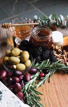 Place the jars of sauces and olives on the board first. Next place the cheeses on opposing sides. Add meats and fruits next. Layer in crackers, nuts and seeds and fill in any spots with extra nuts. Use fresh rosemary or fresh greenery to add wreath accent in the center of the charcuterie board. Garnish with fresh cranberries.