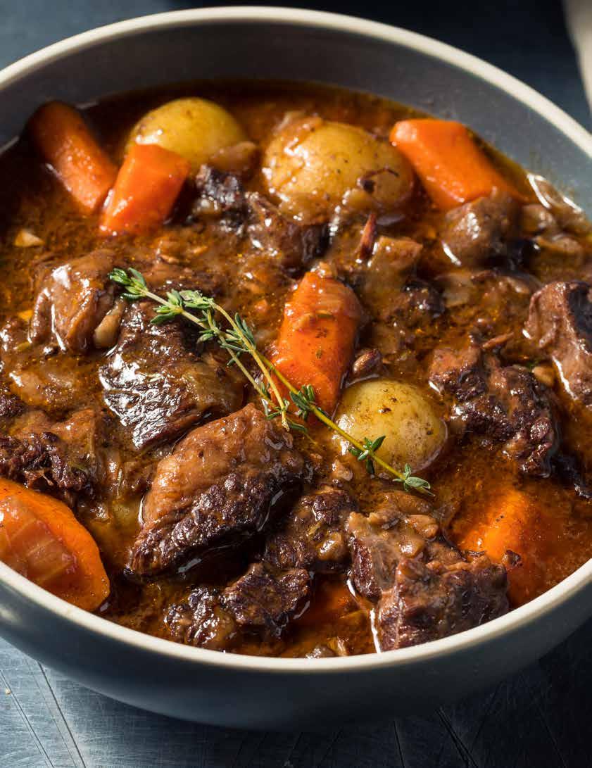 5. Remove bay leaves and thyme stems. Season to taste. If you prefer a thicker, gravy-style broth, whisk together 1 to 2 tablespoons cornstarch with equal parts cold water. Stir into the simmering stew and cook for 3 to 5 minutes, until thickened.
