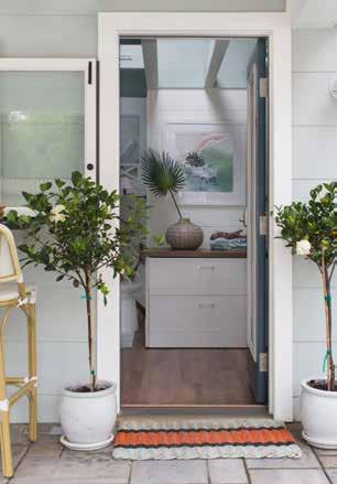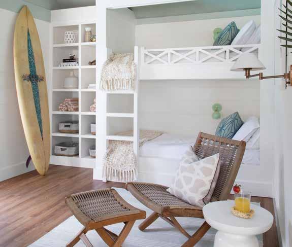 A giant painted surfboard, a mix of ocean-inspired colors, and rustic ceiling beams, original to the structure, infuse a surfer vibe into the cozy easy-to-care-for cabana. Walls are wrapped in wide horizontal shiplap to make the limited footprint feel as expansive and airy as possible, and luxury vinyl planks on the floor ensure that no one will be worried about wet feet from the pool.