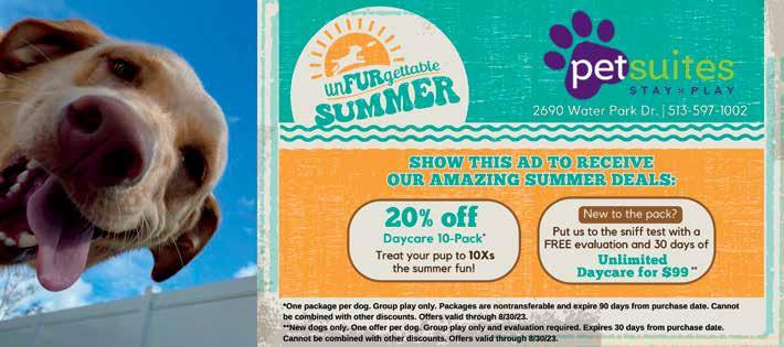 PetsSuites began in Erlanger, Kentucky, and their Mason location off Kings Mills Rd just celebrated its first anniversary. Their state-ofthe-art resorts are colorful, inviting and sparkling clean, always ready for countless hours of enrichment for their four-legged guests. And they’re growing—a new PetSuites resort is being built in Liberty Township with a tentative October opening.