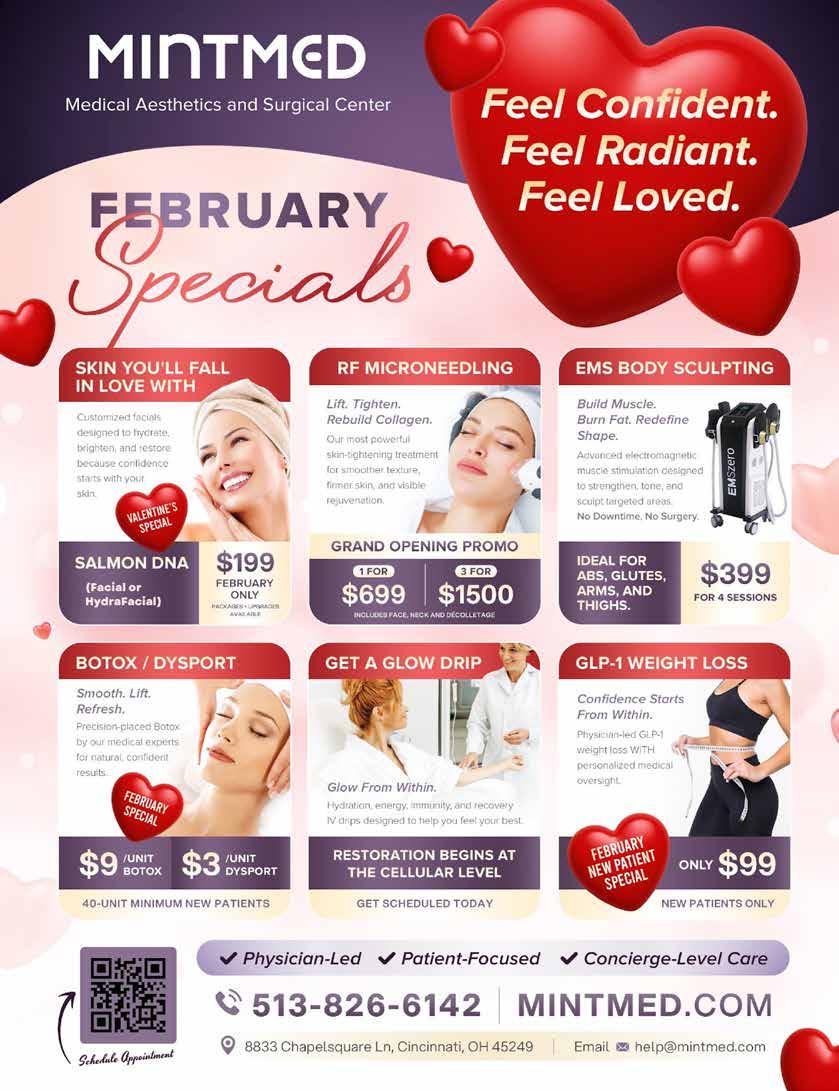 That feeling is no accident. Mint Med, a newly opened luxury wellness, medical aesthetics, and surgical center off MasonMontgomery Road, reflects years of vision and experience from Erin and her husband, Dr. Roderick “Matt” Huff. Together, the Loveland residents have created a practice that blends physician-led care with thoughtful design and a concierge-level experience. It’s a place that prioritizes long-term wellness over quick solutions.