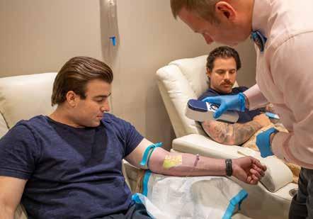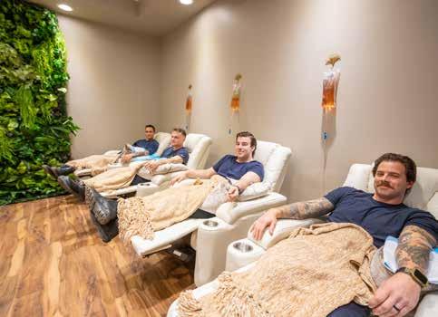That sensibility shows up throughout the space — from deep wood finishes and earthy materials to greenery woven seamlessly into the environment. In the wellness room, soft seating and textured acoustic paneling create a serene setting for IV therapy, where an