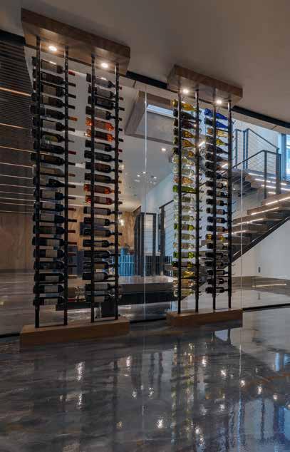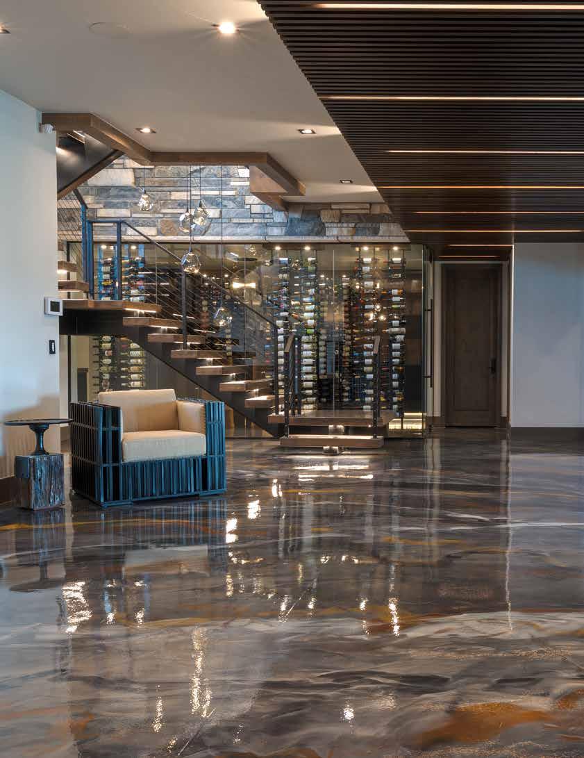The basement of this house does not fall short compared to the upper levels. An earth-cooled wine cellar, home gym, an entertainment area with a projection theater, gun and safe room, full bar, and swing chairs all follow the same modern, edgy theme while demonstrating their own uniqueness to the living space. The wine cellar holds 2400 bottles and is detailed with sumptuous lighting and a six-color epoxy floor. The custom built-in walnut slab with a copper metallic acrylic inlay elevates the room and gives it that rocker touch.