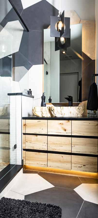 the room. A custom Hubbardton light fixture with blown glass gives the room a robust modern and edgy feel that demands attention and allows your eye to travel to every on-theme detail Ashley included in this space. The master bath is softened by the inclusion of a Sophstone bathtub, counters, and sinks, plenty of sunlight, and a custom built-in hutch with copper mesh doors. The rose copper hardware, faucets, towel racks, and shower head add a nice shine and slight delicate touch to this darker-toned room.