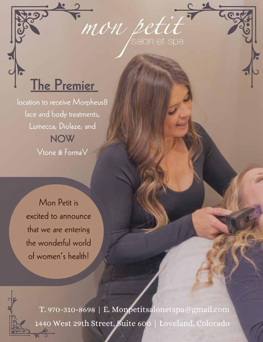 Mon Petit is one of only a few medical spas in NoCo that offers Morpheus8, a premier and innovative skin treatment. Morpheus8 uses a unique tip that has 24 gold-plated and siliconetipped micro-needles that can go up to 4mm deep into the skin. It then uses radio frequency to create an intentional injury into the sub dermal layer of the skin sending collagen and elastin to help heal the treated area. Learn more at www. monpetitsalon.com.