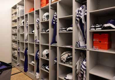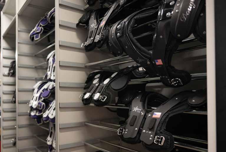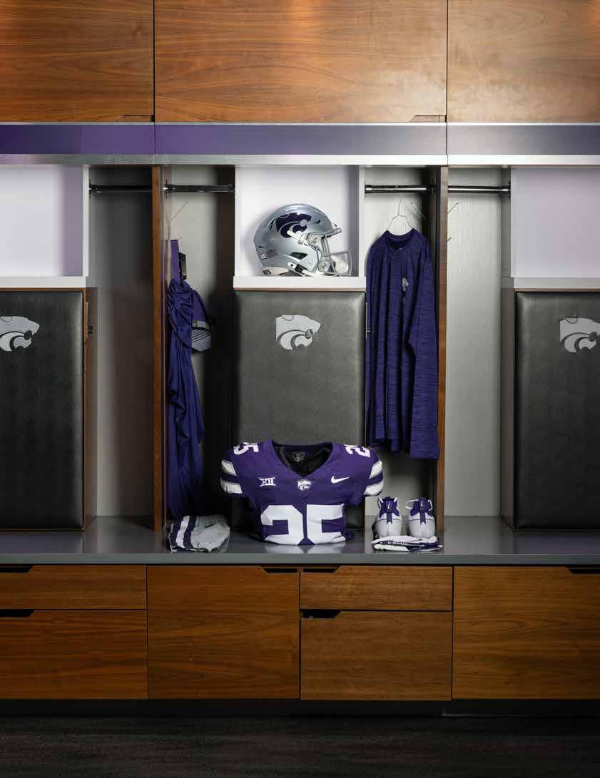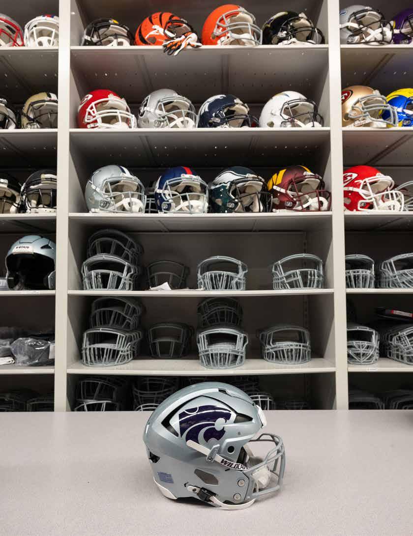 To the left, a large laundry area hums with the constant operation of half a dozen commercial-sized washing machines. To the right, rows of shelves and storage lockers hold every imaginable piece of football gear. The walls are adorned with K-State relics and classic Big Eight memorabilia— banners, a stack of helmets from every NFL and current Big 12 team, and a fully dressed mannequin. The equipment room, perhaps more than any other space in the stadium, embodies the pride and rich history of Wildcat football.