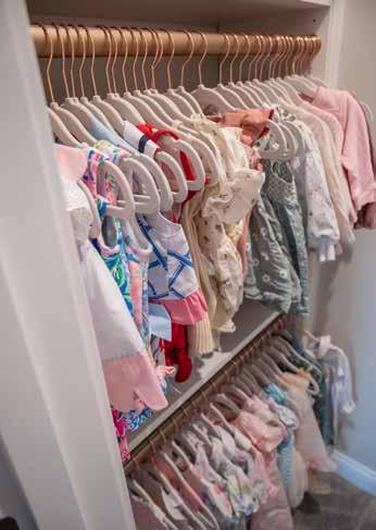 In this closet, Joey maximized space by utilizing triple hanging bars. In time, one of those rods can be removed for a traditional double hang or rods can even be swapped out for additional shelving. “Utilizing triple hang for little girls is a great option because they have so many cute dresses and outfits,” notes Joey. “I used drawers to store hair ties and bows, diapers, etc. and those drawers will be usable for underwear and socks as she grows.”