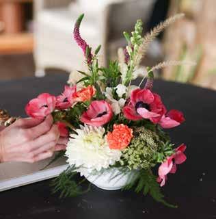 • Begin to arrange florals in the bowl. Start with the strongest, thickest stems and end with the most delicate stems. Here, we began with branches, then the largest base flowers followed by taller focal flowers, and finally delicate stems, grasses and wispy greens.