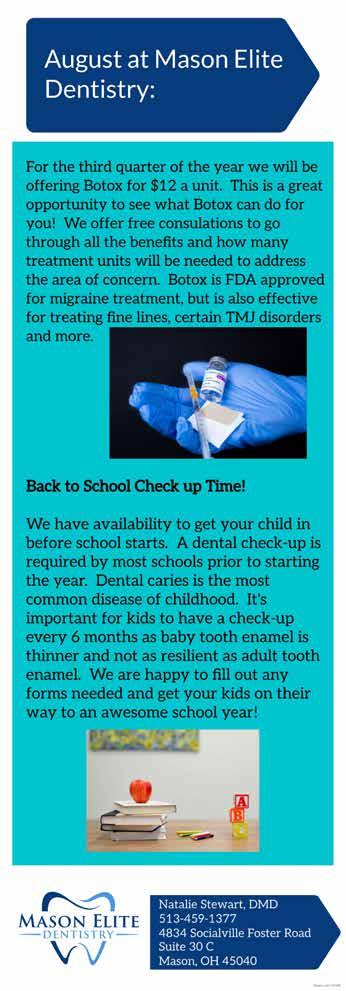 THANK YOU FOR VOTING US BEST CHIROPRACTOR! 2022 READERS’ CHOICE SET YOUR STUDENT UP FOR SUCCESS Ensuring the body’s structure and systems are in alignment can help increase concentration and improve behavior. Let us get your student ready to learn more effectively. 513.754.0050 WWW.EVERYBODYSHEALTH.NET 808 READING ROAD MASON, OHIO 45040 SERVICES: Chiropractic Care | Massage Therapy | Nutrition & Wellness An injury can happen in an instant. With fall sports around the corner, make sure your family is protected. DON’T PLAY WITHOUT US! DISABILITY ACCIDENT CANCER LIFE SCAN CODE TO LEARN MORE CLINT ANDERSON INFO@4SQUAREINS.COM mason eye center 6667 Western Row Road, Mason, OH 45040 // (513) 770-4220 // masoneyecenter.com Does Your Child Keep Getting... NEARSIGHTED? more... and more... and more... We have your solution: We offer MYOPIA MANAGEMENT. | Schedule Today. 8
