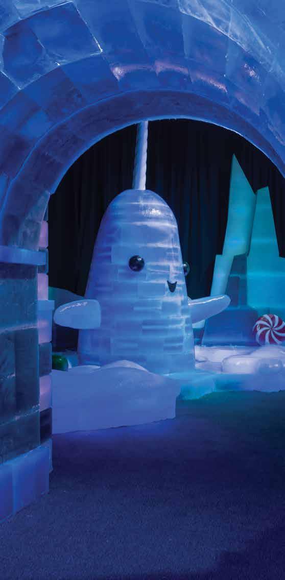 expert artisans from Harbin, China. Following a 300-page design book filled with sketches and blueprints to sculpt each individual piece — some as small as a coin and others nearly 30 feet tall — the artisans work for six weeks to create the 20,000-square-foot attraction. They use chisels, chippers, tongs, handsaws, grinders and even chainsaws to bring the experience to life.