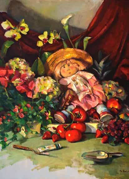 One painting especially stands out as a memorable gift. “Early on, my dad came up with a series of large-scale still lives for me to paint. He and my mom once owned a flower shop called Holiday Florist — with the tagline ‘Make Every Day a Holiday.’ That’s how I grew up — joyful, fun, celebratory, memorable. My favorite setup was one Dad brought to my studio at Christmas in 2012. It was overflowing with flowers, fruit, and a favorite doll from my mom’s collection. I could barely pause the week it took me to paint it. Garden Girl was the result — and it hung proudly above their piano. Dad passed away in 2021, but he’s still out there rooting for me.”