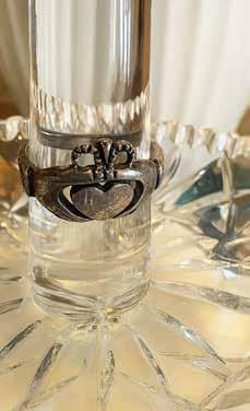 1: A silver Claddagh ring embraces a crystal stem, a timeless token of love and loyalty. 2: An intricate silver heart, a delicate heirloom holding the light of a thousand memories. 3: Golden mementoes of affection, resting elegantly on porcelain like a quiet love letter. 4: Delicate winter berries and a conch shell, a hand-drawn sketch of seaside serenity. 5: A soft bouquet of roses and hydrangeas, blooming with the gentle colors of romance. 6: Faded petals in vintage vessels, a nostalgic tribute to love that never wilts. 7: Rich chocolate cake and sweet strawberries. A decadent indulgence made for sharing with someone special.