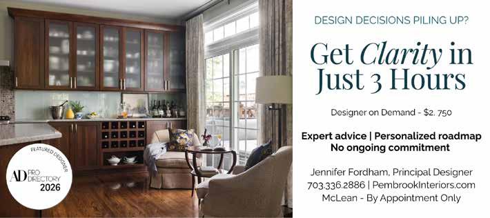 McLean-based Pembrook Interiors has launched Designer on Demand, offering accessible design expertise without the commitment of a full-scale project. This tailored 3-hour consultation addresses specific design questions—from color palettes to furniture placement—while providing professional guidance and a clear, actionable plan clients can implement themselves. “We help homeowners fall in love with their homes again,” says Jennifer Fordham, AD PRO Directory designer and owner. “Spaces should feel collected, not contrived.” PembrookInteriors.com | 703.336.2886