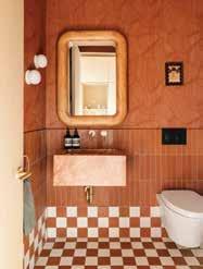 If there’s one place Manz encourages clients to take risks, it’s the powder room. Here, she leaned into terracotta earth tones, layering textures and tile sizes for visual interest and warmth. Patterned and solid tiles work together, while textured wall coverings and a sculptural stone sink elevate the space from functional to delightful.