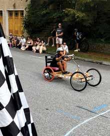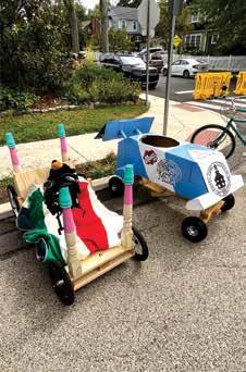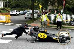1: Edgmont Township’s Historical Society trolley entry in Downhill Derby. 2: Jesse Gennett and Dom Glisson of Greatest Hits, Records & Books with a quick start. 3: With a little “help” from a friend named “Herman,” the race is on! 4: Brothers Mario and Luigi along with the Mushroom are off to the races. 5: Carts at the ready in the first annual Delaware County Historical Society Downhill Derby. 6: Racers Juliane Smith and Valerie Giocobbe from Three Potato Four play to the crowd. 7: Racers compete against the clock in time trials at the First Annual Downhill Derby. padelcohistory.org Photography by Scott Davidson