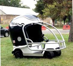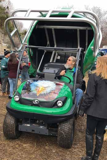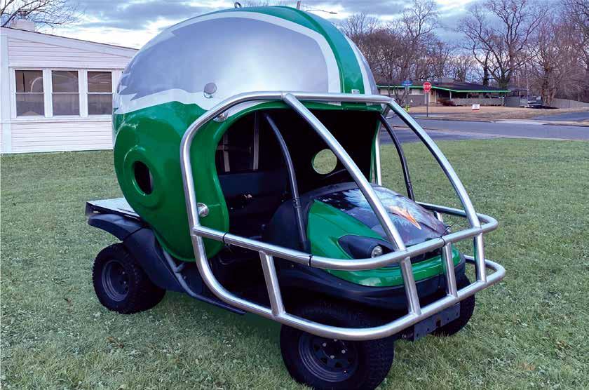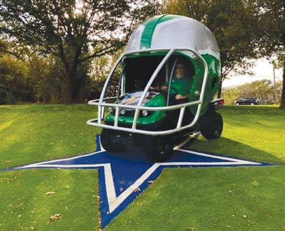 reinvented the helmet carts. He eventually had three, including one originally from Washington (a Redskins helmet that was repainted to a green Eagles helmet) and a road-ready Kubota version created in 2017. That model even made a cheeky appearance on the Dallas Cowboys’ midfield star during a trip to Texas.