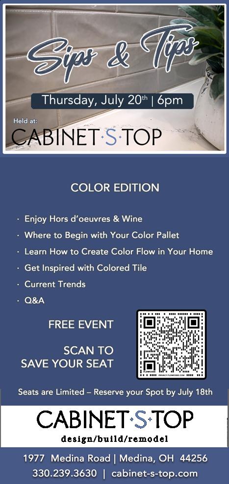 Join Cabinet-S-Top for a class about how to create a color pallet for your home, get inspired with colored tile and discuss 2023 color tile trends. Plus, enjoy hors d’oeuvres and wine. The class is free to attend. Reserve your seat by calling 330.239.3630.