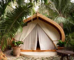 Naviva boasts 15 luxury tents with canvas walls that can be rolled up or down. Each tent has panoramic coastal views, open-air living rooms, expansive decks, and private plunge pools. The interior of the tents is decorated with natural materials, many of which are made by local artisans.