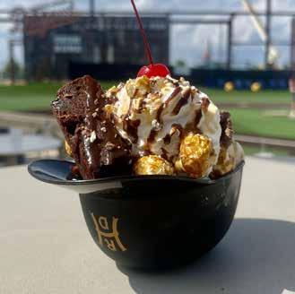 Home Run Dugout recently added a new sweet treat to its summertime menu. Indulge in their Brownie Sundae, made with salted caramel and vanilla ice cream, warm brownies, chocolate-covered pretzels, crackerjacks, hot fudge, caramel, whipped cream, and a cherry served in a helmet.