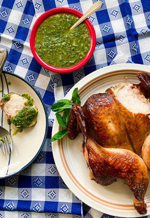 To prepare your grill, stage the charcoal in a pile on one side of the basin and light. This will create heat zones for direct and indirect cooking. Allow the charcoal to burn until covered in ash. Meanwhile, use kitchen shears to spatchcock your chicken by cutting out the backbone. Lay the bird breast side up and slightly splayed out, press firmly in the middle of the breasts to flatten.