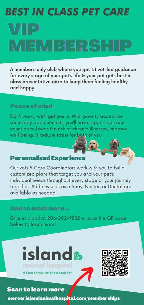 Before we dig into the issue, we wanted to acknowledge our Pet Services partner, the Island Animal Hospital. The cover photo is a tribute to all the pets and pet owners on Mercer Island! Here’s to you!