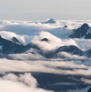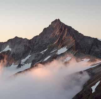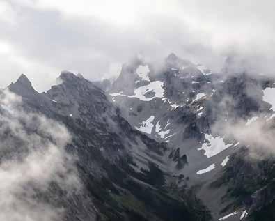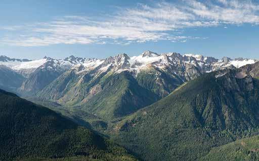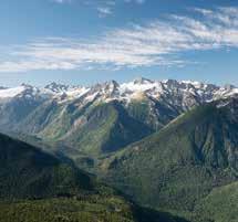 meadows and soaring conifers; ample moisture often leave the mountains surrounded by clouds, adding to the sense of mystery; meltwater from the snow and glaciers trickle down to form great rivers that ultimately gave the mountain range its name.