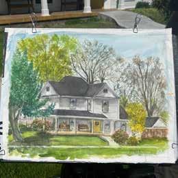 In downtown Meridian, we saw Plein Air artist Mike Polk just finishing this watercolor of the venerable Tolleth House. Over the coming months, Meridian may see more of the Plein Air Painters of Idaho out and about. They are now painting throughout the neighborhood and getting ready for their August Meridianthemed exhibit at Initial Point Gallery. Artist Mike Polk and Hidden Gem Events owner Elizabeth Burgess are shown here with Gunner, a well-known dog in the area. Elizabeth has put a lot of effort into renovating this old building and opening this location for celebrations, weddings, and other events. In 1997, this building, which is on 2nd and E State Avenue in the heart of Meridian, was added to the National Register of Historic Places. MeridianCity.org
