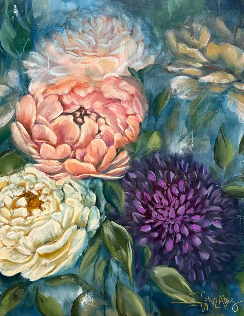 Ellen Gonzales has always loved art. While she used to play with watercolors, her mom would paint her entire house in florals. As she shares the stories about the intricate floral patterns and creations her mom used to make, she laughs because she hated it as a child. She wasn’t a girl really into flowers or florals, and her mom was adding florals to almost any surface she could get her hands on. The irony of her childhood and floral surroundings is not lost on Ellen; her laughter continues as she reminds me that she exclusively paints florals. Her mom finds it funny too.