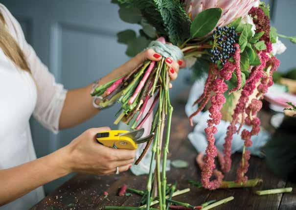 Step 2: Now it’s arranging time — think focal and filler. The best way to start the arranging process is by choosing your most interesting or favorite flowers — this will be your focal point. Hold the focal flower(s) upright and add your supporting blooms around it. Make sure to turn the bouquet as you build so that the design is as desired. Once this is complete, add your filler flowers to finalize the look. Filler options include baby’s breath, ivy, fern, eucalyptus and more.