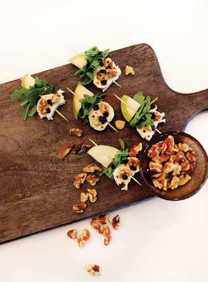 • Take (4-inch) skewer, add pear, arugula, and cheese.