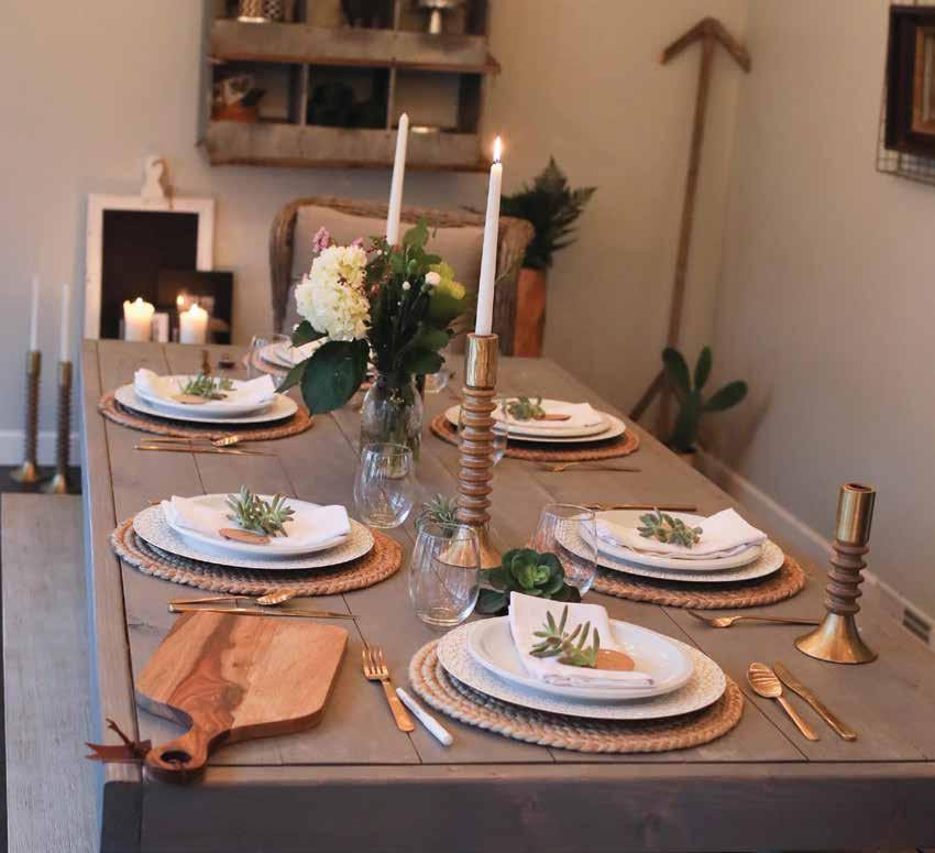 Autumn is a lovely season to have friends and family over for dinner. Why not host an elegant but casual gathering before the holiday craziness begins? A table setting of white dishes, woven placemats, copper utensils, and linen napkins decorated with succulent or herb clippings creates a stylish atmosphere conducive to conversation and enjoyment. This simple menu will allow you to host a stress-free evening.