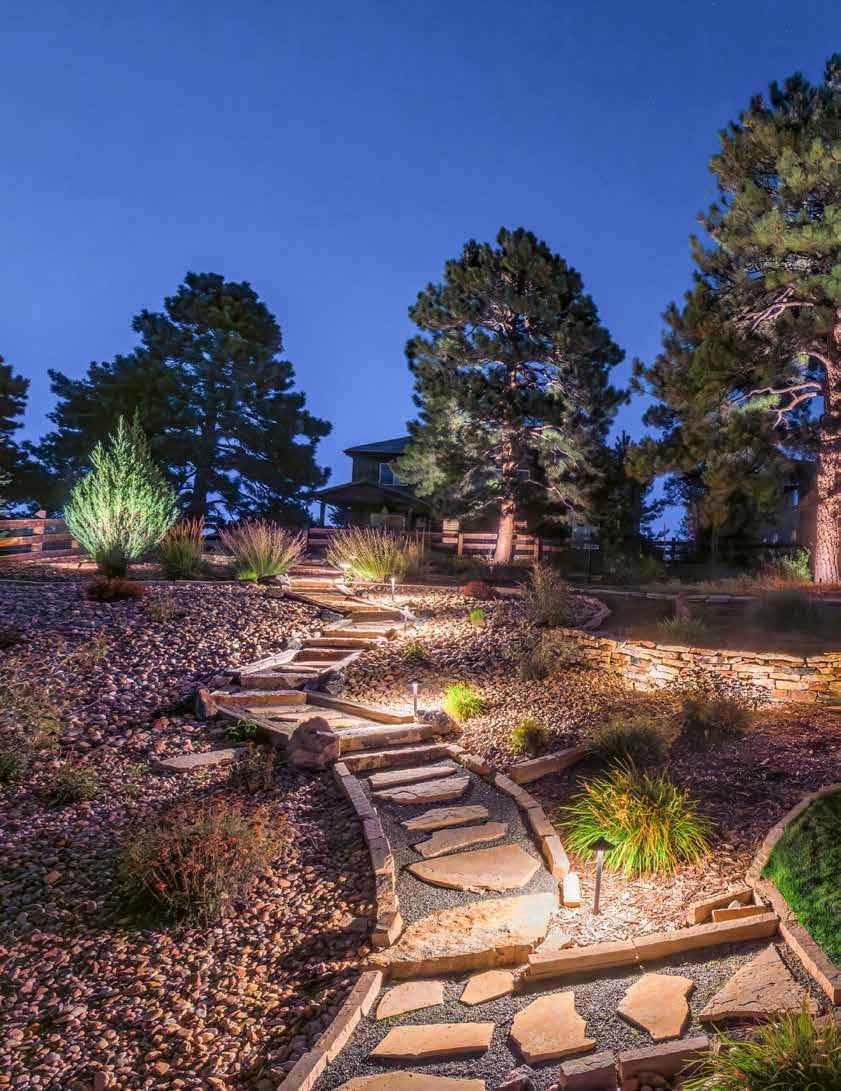While the company offers everything from deck and patio lighting to festive string lights and permanent holiday displays, Gina admits, “We really love doing landscapes, especially backyards. Colorado has so many water features—fountains look incredible when lit just right. It’s where we get to be the most artistic.”