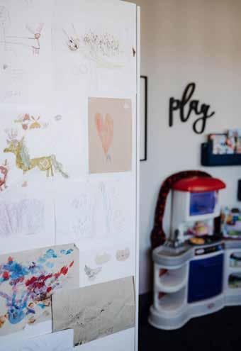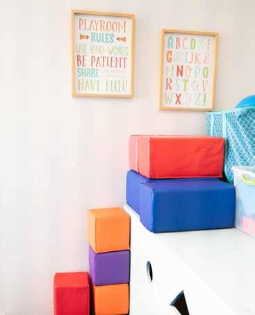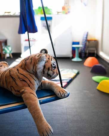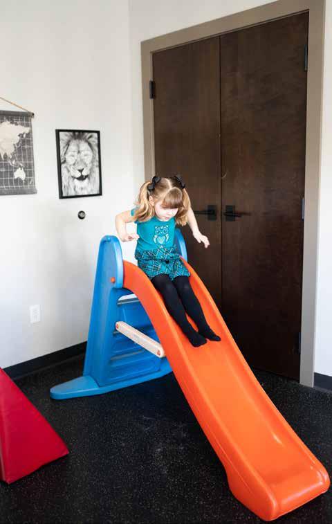 Integrated TherapyWorks, which was founded in 2011, opened its current Higgins location in 2020. The waiting room boasts toys, books, plants, and art created by a client. Inside, visitors encounter a climbing wall, a punching bag, various swings, a ball pit—and that’s just in the downstairs gym. In addition to outdoor space, a second gym upstairs and plenty of rooms where 19 therapists can see clients and get paperwork done, the building also has a kitchen where clients are exposed to different sensory textures and work on fine motor skills.