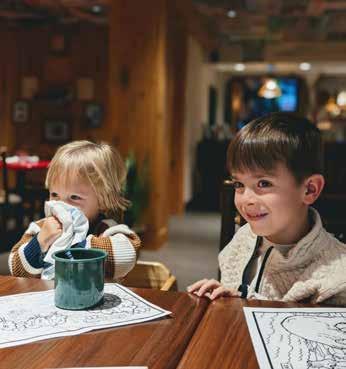 On the main floor near the living room-like lobby, known as The Great Room, is Dry Fly Saloon—the ultimate all-day dining destination where anyone can belly up for a cold beer or a hot meal that feels like home. The bold design of a ceiling collage of magazine covers and the hidden river names found within the overhead table lights are subtle reminders that adventure is just a sleep or recharge away. With ample bar seating, a conversation isn’t hard to find. Meanwhile, my little family scrambles over a word search with a mug of crayons spilling onto the table. A steak with a thick ribbon of chimichurri is served to my husband and a flaky chicken pot pie is nested in a cast iron pan for me—a delight on a winter day!
