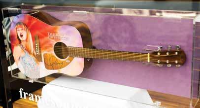 “We have an original movie poster from the Eras Tour movie, old-school 33 albums airbrushed, and hand painted with her image, and an ‘autographed’ acoustic guitar,” he says. “These albums have been such a hit that he’s had to reorder them four times from a little shop in Porto, Portugal, that he found while traveling. “