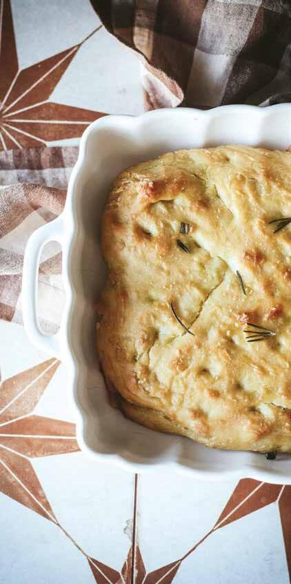 Preheat the oven to 425°F. Drizzle the remaining 2 tablespoons of olive oil over the dough. Rub your hands with olive oil and use your fingers to make indentions on the surface of the dough. Sprinkle it with salt and rosemary and any desired toppings. Bake for 20-30 minutes or until golden brown.