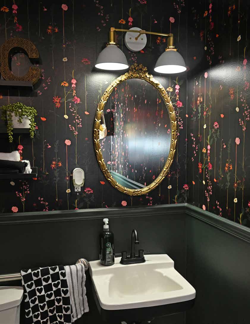 POWDER ROOM: "Everybody who comes in uses the bathroom, so the powder room was super-important to me. The black wildflower wallpaper is from Spoonflower—it makes you never want to leave the place. And the paint under the chair rail is a really freaking cool dark green—'Jasper' from Sherwin-Williams.”