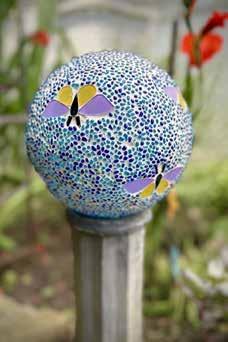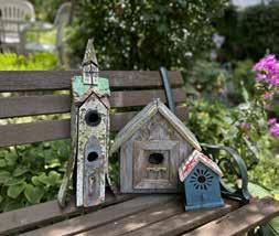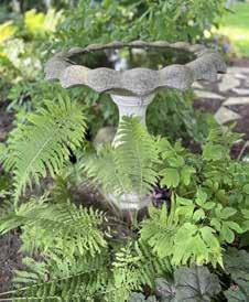 8: Concrete bird bath graces a shade garden, nestled amidst lush ferns for a tranquil retreat. 9: Jennifer and Emily cultivate a garden blending edibles, medicines, and beauty for a holistic touch. 10: Nonna’s Garden: Paul Palazzolo’s 1970’s multi-tiered oasis with a bridge, crafted for his wife, Mary. 11: Three weathered birdhouses on a garden bench create a charming, rustic vignette of nature’s serenity. 12: Enchanting mosaic gazing ball with glass butterflies adds whimsical charm to any garden space. 13: Michael Bewley and Denise Winter’s backyard blooms with stone pathways, wildflowers, lilies, and red crocosmia. 14: Beloved by pollinators, Black-eyed Susans make this urban garden glow with their golden-yellow beauty. Photography by Kimberly Janowicz