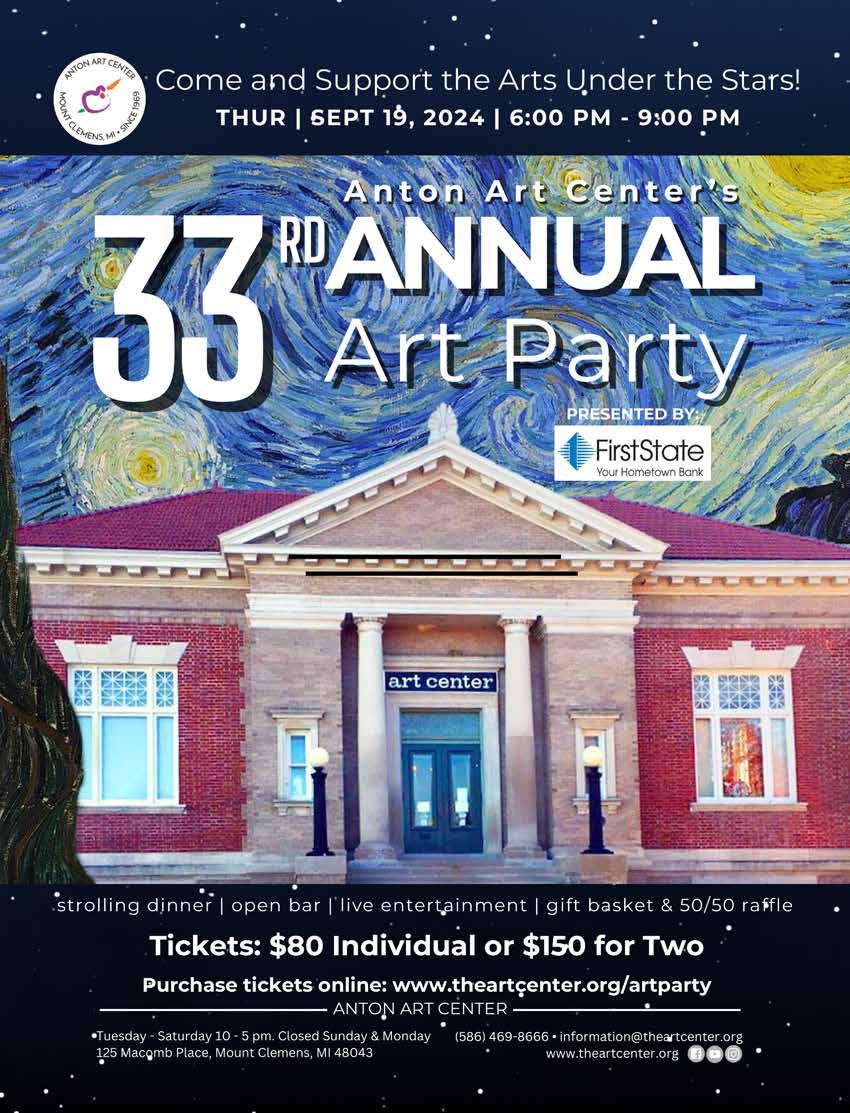 What would autumn be without the cultural crescendo of the year, ArtParty at the Anton Art Center? This gala is more than an event; it's a celebration of the artistic spirit that defines Macomb County. We cordially invite you to an evening of dazzling art, culinary delights, stylish attire, and live music. Don't miss the annual night our community unites in its desire to support the life-affirming impact of the arts.