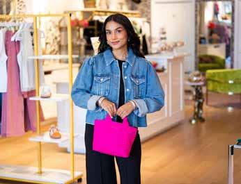 Our beautiful model Vanessa shows how you can keep it classy and chic while running errands. She is wearing a Paige denim jean jacket over her Ripley Rader set, along with Back 70 pink metallic sneakers. She’s also added a pop of color with her Parker and Hyde bag.