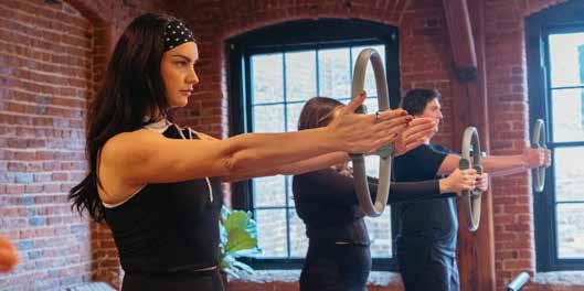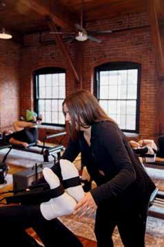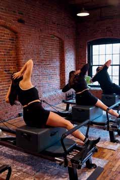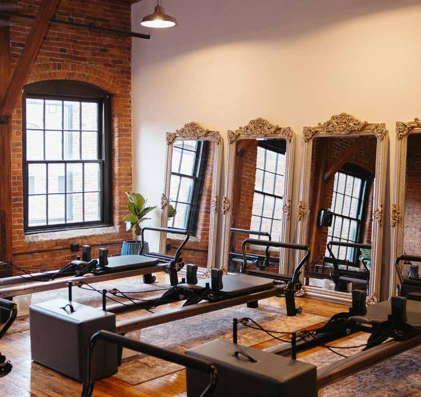 studio, hosting only about 8 clients per class, and the walls and ceiling are made of exposed brick and natural wood beams. When you step off the reformers, your feet land on plush vintage rugs, and you can check your form in stunning antique-inspired mirrors.