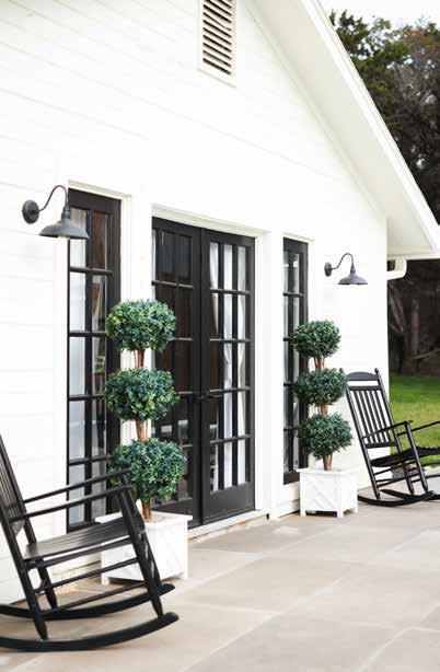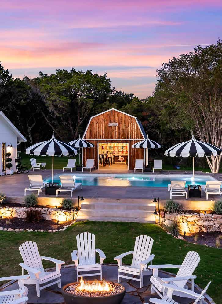 An integral part of the 8Sages experience is the spectacular outdoor amenities. Enjoy outdoor dining under the twinkling lights of ancient oak trees and watch picturesque Texas sunsets from the porch adorned with rocking chairs and an oversized swing. Unwind around the oval-shaped fire pit after dinner, or enjoy a relaxing dip in the heated resort-style pool and oversized hot tub. Enjoy a drink at the Instaworthy Sisterface Bar, decked out in glitzy Texasthemed décor and equipped with bluetooth speakers for your music playlist.