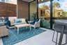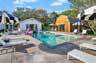 The 1,400 sq ft bunk house features a modern-rustic design, providing both comfort and entertainment, including a game room lounge, a spacious dining area, and a large bathroom with a walk-in tile shower. It also offers a separate exterior entrance for outdoor access, a fully-equipped laundry room, and an extra full-size fridge for convenience. The intimate 800 sq ft guest house delivers a charming, romantic retreat with a 1 bed/1 bath layout, direct pool access, and tranquil views through French doors. Inside, guests find a workspace, a lounge area, and a spacious bathroom suite.