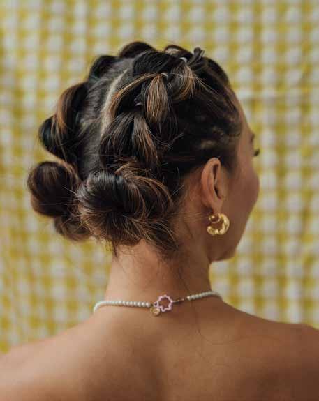 Part hair down the center. Create pullthrough braids on each side of the head. Tie elastic at the end of the braids to create a ponytail at the nape of the neck. For extra volume in the buns, tease the hair in the ponytail before twisting it into a bun. Secure with hair pins and... Voilà!