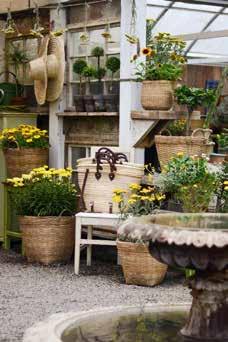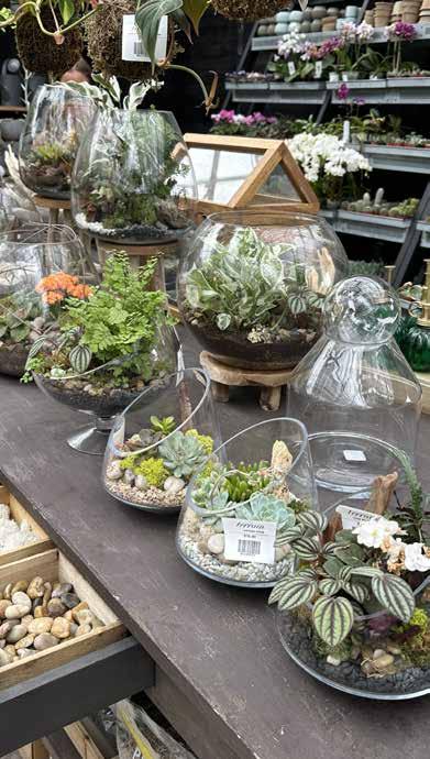“Bringing the outdoors in,” is a theme woven throughout the indoor shop, with décor such as metal awnings and vintage botanical posters, giving the space an outdoor market feel. Natureinspired products are attractively displayed, including wreaths, garlands, candles and candle holders, housewares, kitchenware, cheese boards, linens, tableware, spa accessories and indoor/outdoor lighting with a variety of transparent, opaque and uniquely shaded bulbs. The growhouse features a moss wall, plants and terrariums, including charming herbal and floral arrangements, premade by DBT specialists, that look like they were fashioned by woodland fairies.
