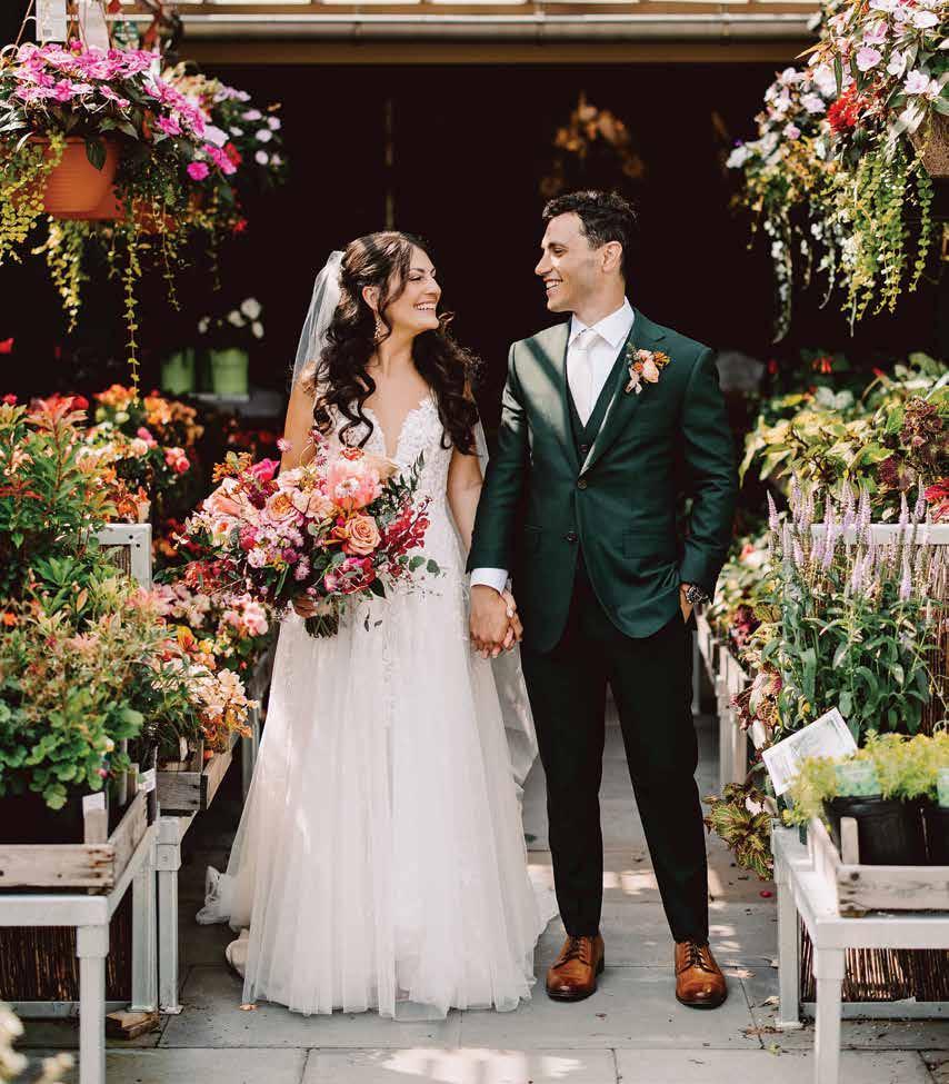 It can be a sculptural non-seasonal look, such as a monstera leaf perched in a vase. Monsteras come in a variety of shapes and sizes, can last weeks to months in water, and are supplied easily by a florist.
